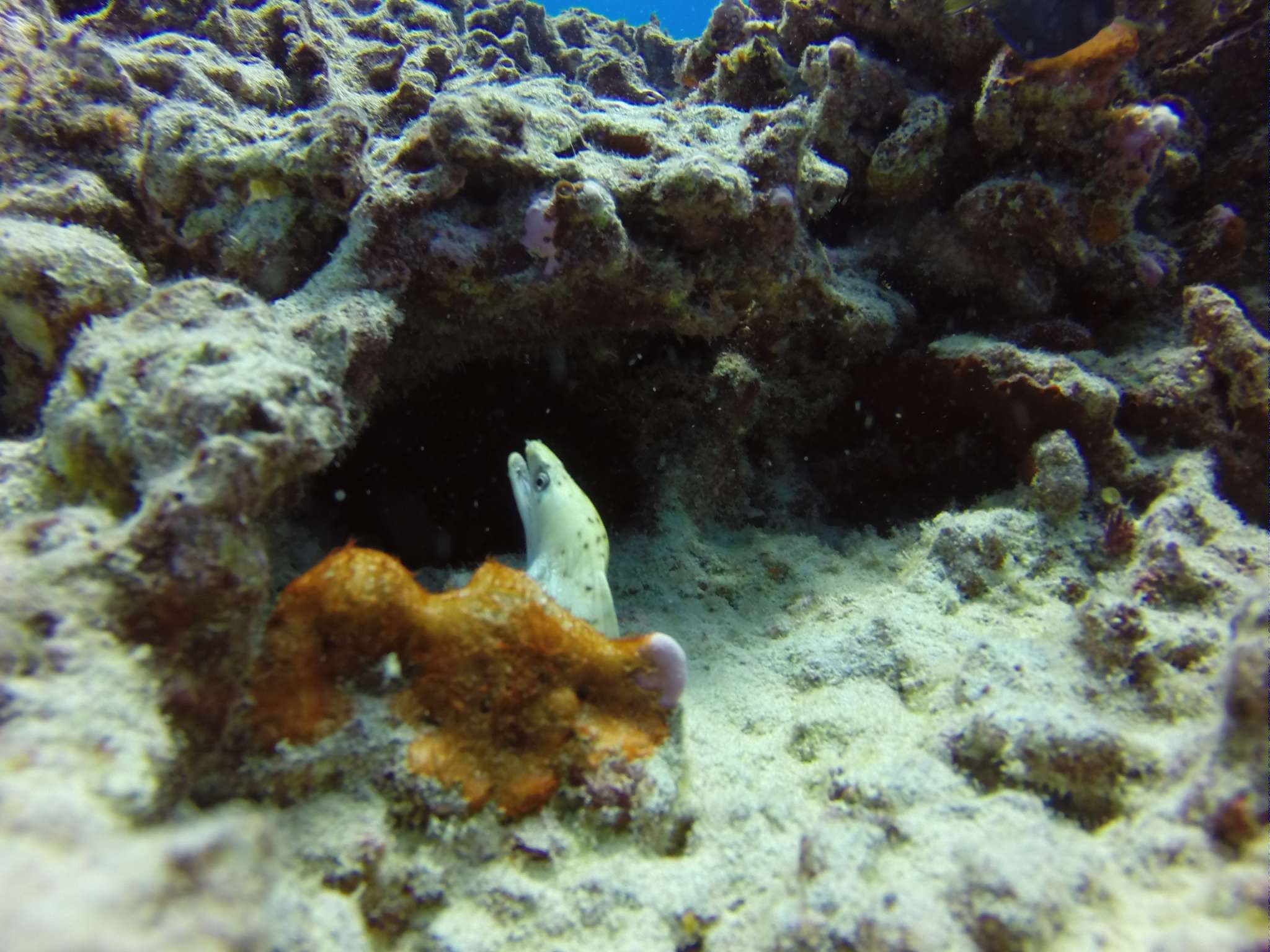 Marine life observed: garden eels, rock scorpion fish, leaf scorpion fish, helmet shells, trident shells, school of porcupine fish, and gold lace nudis