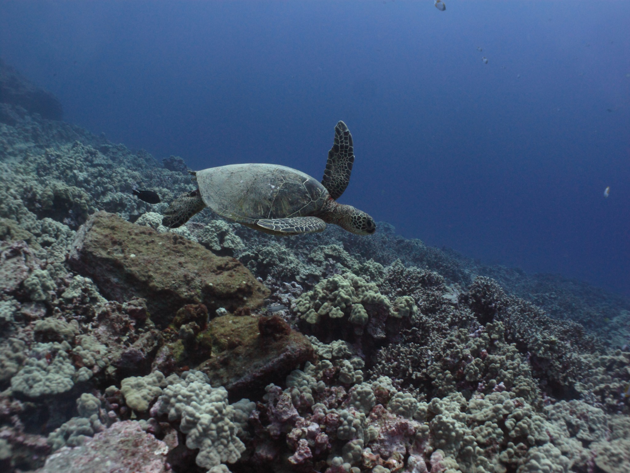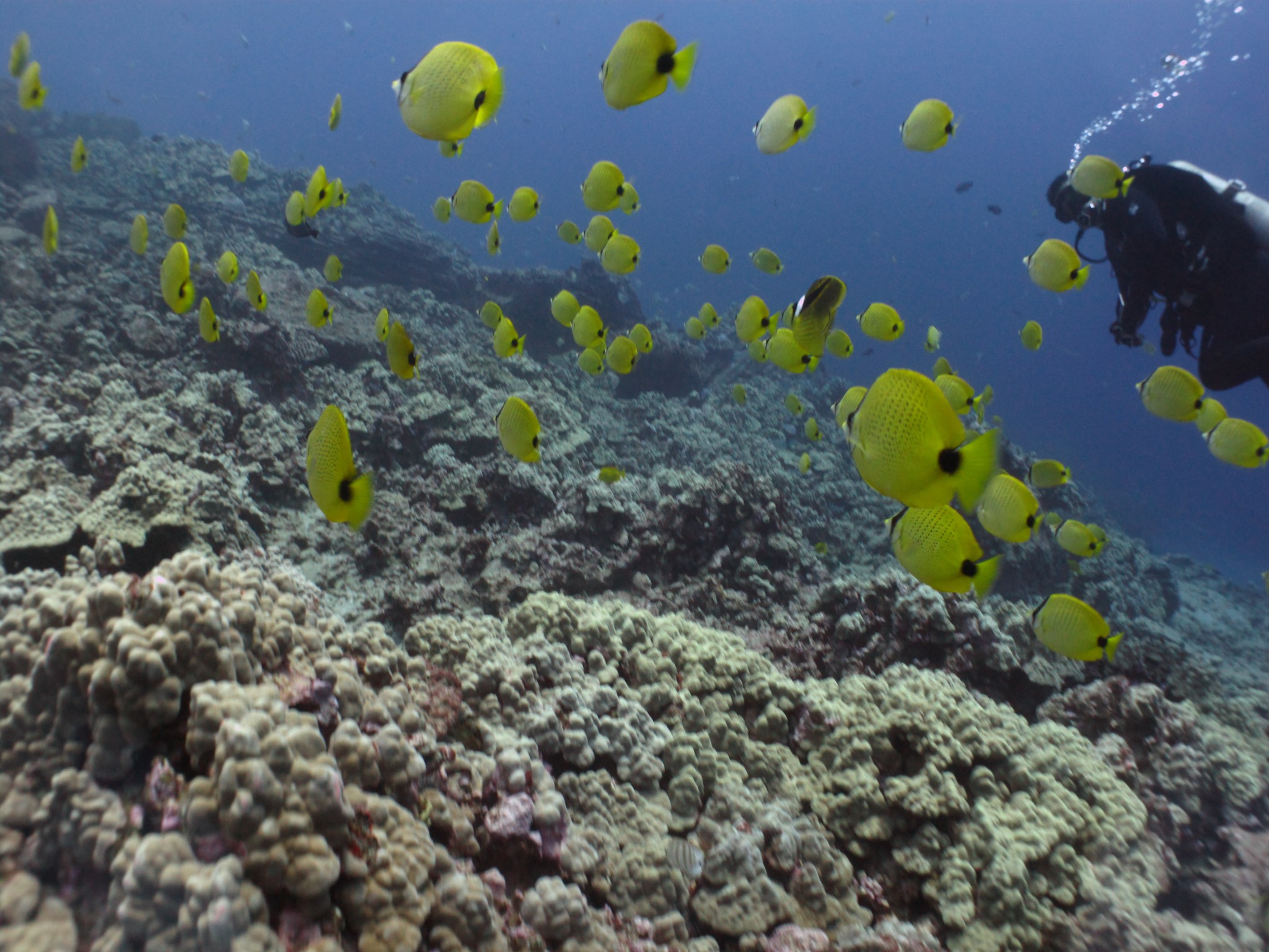 For the second dive we drifted Sea Cave and again the viz was perfect. There was a turtle resting inside the cave and a few more swimming about outside it in the current. There were also eels all about the area and milletseed butterflyfish following us along the reef. The reefs off of this area are some of the best on Oahu with great coral growth and fish everywhere. The current moved us along at a good pace, so much so that we ended up infront of Hanauma Bay by the end of it. A great day for being out on the water.
