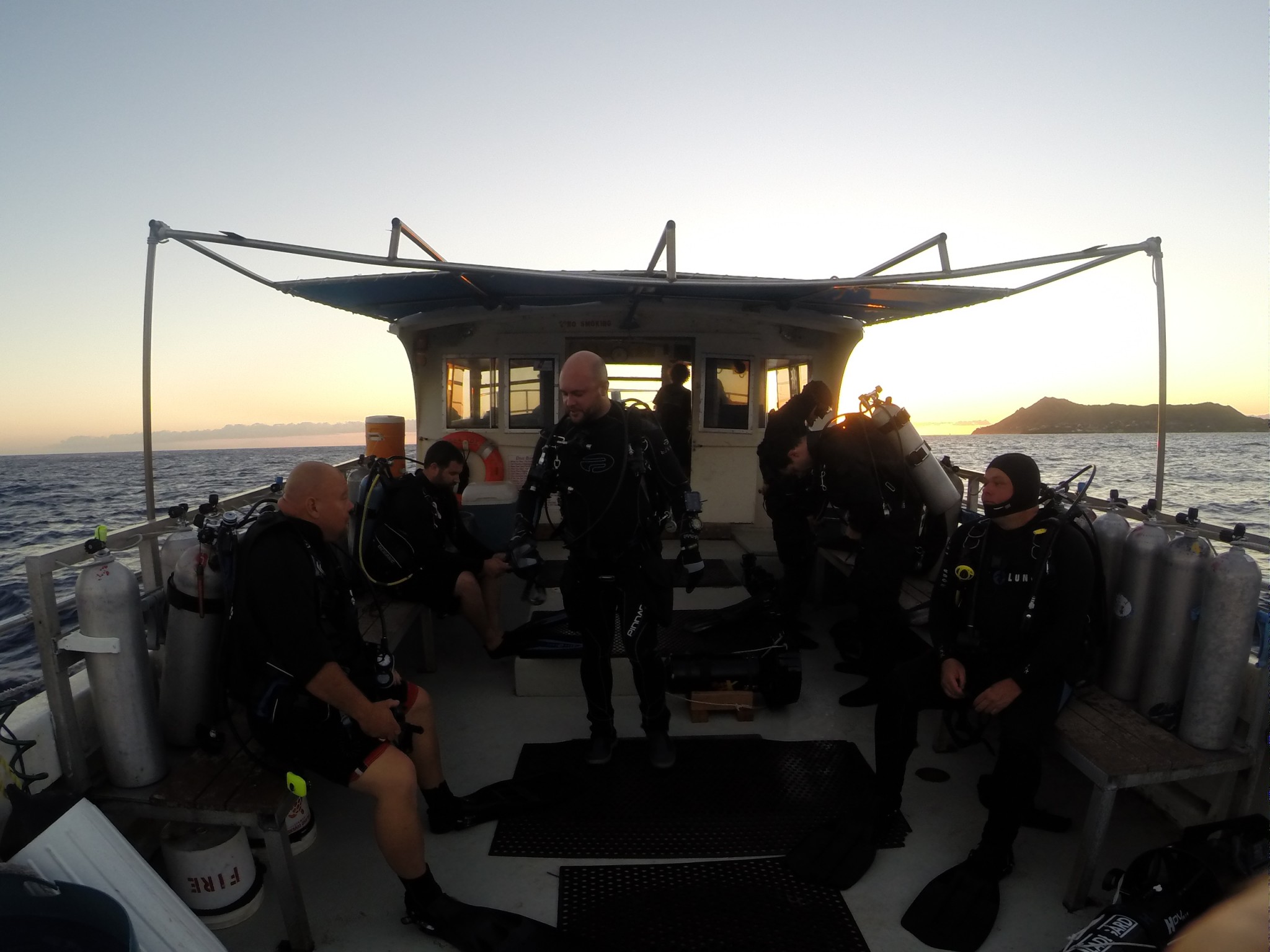 Wednesday night Stu, Ryan, Brent, Nic, Mike and I all jumped into super clear water and descended on the Kahala Barge. Once again we had divers with torches in their hands that shined like the sun; its always an impressive sight. I was interested to see what crawls and swims at night on wrecks. Every hole I looked into: slipper lobster. No joke. Down inside the barge? Blue crab. Delicious. We moved onto the Sea Cave. Brilliant. A Black Trevally meets us at the entrance. Delicious. Lobster everywhere, starting to get hungry…. Surf and Turf anyone? And then Surf again?